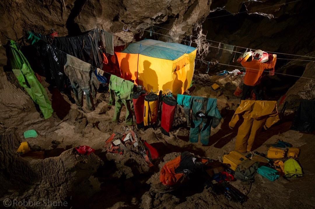 We monitored the situation and nobody left camp apart from the leader; the late (great) Pavel Demidov and another team member. They went to check the water level of a nearby siphon (the water-table). Whilst the pair were away, myself and Jeff Wade; my photo assistant, kept busy by taking photographs of the team in the tent at camp. One member went over to a nearby hole as he thought he heard a gurgling sound …but nothing. Less than five minutes later, he went back and checked again. I’ll never forget the look on his face, as he turned to me. He was white! I ran over and to my horror saw foaming water rising within the hole so fast! Panic set in. I turned to Jeff and said “we need to leave right now”. I looked at all my photography equipment laying around on the floor, and knew I didn’t have time to pack it away, let alone carry it up at speed. I did however, have time to grab the two memory cards from inside the camera. I put them into their plastic containers and then a waterproof bag, shoved them into my pocket. Every caver in camp knew we had to act fast. We threw on our dry suits, harnesses, and climbing gear, preparing for the impossible.